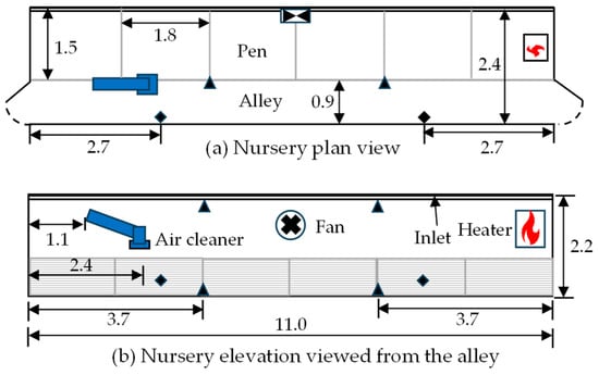 Nursery layout—(a) plan and (b) elevation. The filled triangles show the locations of the temperature sensors, while the diamonds show the locations where PM and microbial samplings were performed. All dimensions are in meters. Not to scale.
