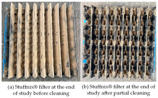 Typically, with filters and ESP, RE increased with particle size [24]. Averaged over the 5 d, RE was highest for the PM15 fraction and, surprisingly, lowest for the PM10 fraction, though the four PM fractions < 10 μm had similar RE values (Figure 5f). The Stuffnix® filter reduced layer house emissions of PM10 by 40%, but it did not reduce PM2.5 emissions [24]. However, the Stuffnix® filter reduced layer house indoor concentrations of PM2.5, PM10, and TSP by 63, 57, and 55%, respectively [20]. Winkel et al. [24] reported inlet PM10 concentrations of ~2.9 mg∙m−3, much higher than in this study, but their inlet PM2.5 concentrations (<0.2 mg∙m−3) were generally lower, and a much smaller fraction of PM10 (Figure 5) than in this study. Differences in PM properties between swine and layer houses might explain the difference in Stuffnix® performance between this study and published studies [20,24]. No studies on the use of Stuffnix® in pig houses are available.