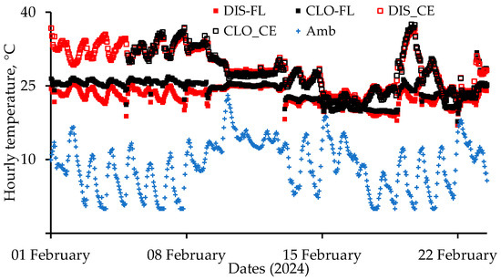 Hourly temperature data of the four sensors inside the nursery during 1–24 February 2024 are presented in Figure 4. Also presented are ambient hourly temperatures measured at the Reedy Creek Field Labs, Raleigh, 3.7 km from the CVM nursery. Temperature data from the logger near the ceiling close to the air cleaner (CLO-CE) were lost during 1–5 February. During 1–9 February, when both the brooder lamps and forced air heater were operating, the average floor temperature close to the air cleaner (CLO-FL) was 25.6 ± 0.7 °C vs. 23.5 ± 1.1 °C for the more distant logger near the floor (DIS-FL) (Figure 4). Floor temperatures near the air cleaner were slightly higher than the more distant floor temperatures later, even when the brooder lamps were turned off. This smaller difference was due to higher ventilation rates because of older pigs and warmer weather during 10–16 February (Figure 4). It was colder during 16–22 February, causing the forced air heater to run longer, and the heater’s blower (~0.12 m3∙s−1) provided good air mixing. With similar ceiling temperatures at the two locations, because floor temperatures closer to the air cleaner were higher, the air cleaner reduced thermal stratification near the air cleaner.