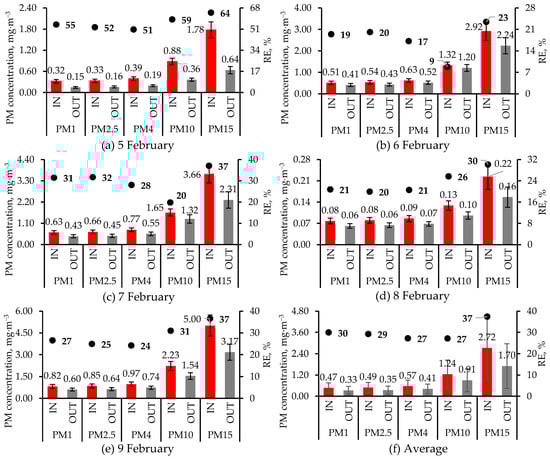 Concentrations of PM fractions at the air cleaner inlet (IN) and outlet (OUT) and removal efficiency (RE, Equation (3)), bolded, during 5 d in February 2024, as well as their average. Except for 9 February, when one set of 10 min (1 Hz) measurements were made at the IN and OUT locations, on other days, two sets of measurements were made at each location, which were then averaged. For each day, the mean and SD (error bar) for each PM fraction are based on 600 1 s measurements. However, in (f), each value and its error bar are the average and SD of the five daily values. On every date and for every PM fraction, the IN concentrations were significantly higher (t-test p < 0.01) than the OUT concentrations. Statistical significance was not tested for the average PM fractions (f). The figures have different primary and secondary Y-axis scales.