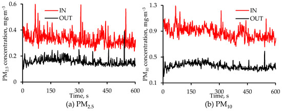 Diurnal changes in the air cleaner IN and OUT concentrations of (a) PM2.5 and (b) PM10 on 5 February 2024. The measurement frequency was 1 Hz, and each value is the average of two values, one from each set of measurements at that location. The Y-axis in the two figures above have different scales.