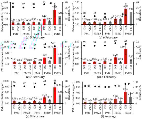Concentrations of PM fractions in the alley close to (CLO) and distant from (OUT) the air cleaner on 5 d during February 2024. Reductions in concentrations of PM fractions at the CLO location vs. the DIS location are also shown. Except for 9 February, when one set of 10 min (1 Hz) measurements were made at the CLO and DIS locations, on other days, two sets of measurements were made at each location, which were then averaged. For each day, mean and SD (error bar) for each PM fraction are based on 600 1 s measurements. However, in (f), each value and its error bar are the average and SD of the five daily values. On every date and for every PM fraction, the DIS concentrations were significantly higher (t-test p < 0.01) than the CLO concentrations. Statistical significance was not tested for the average PM fractions (f). The figures have different primary and secondary Y-axis scales.