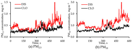 Diurnal changes in concentrations of (a) PM2.5 and (b) PM10 on 5 February 2024 at the CLO and DIS locations in the alley. The measurement frequency was 1 Hz, and each value is the average of two values, one from each set of measurements at that location. The Y-axis in the two figures above have different scales. Both Y-axis scales are truncated to improve resolution.