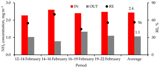 Time-averaged NH3 concentrations at the air cleaner inlet (IN) and outlet (OUT), and removal efficiency (RE, Equation (3)). The scrubbers were turned on for 30 min and off for 30 min.