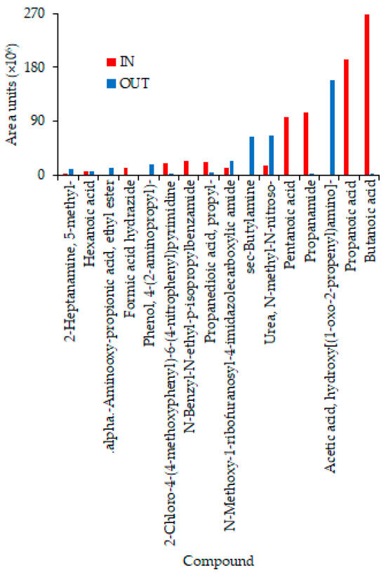 Ten and 24 VOCs were identified in the IN and OUT samples, respectively, on 22 February 2024 using SPME fibers (Table S2). The total area of the VOCs in the IN and OUT samples were 3.86 × 108 and 1.45 × 108 units, respectively, showing that the SPME fibers increased the number of gases detected as well as their concentrations vs. the gas samples. Ten compounds with the highest total (IN + OUT) concentrations are compared in Figure 10. High concentrations of some odorous volatile fatty acids (VFAs) present in swine houses [29], namely, butanoic, propanoic, and pentanoic acids in the IN sample, were greatly reduced or absent in the OUT sample (Figure 10). However, only the OUT sample had a high concentration of sec-butylamine, an odorous compound. Surprisingly, the benzaldehyde derivative was the only common compound in the OUT samples collected on 20 and 22 February 2024 (Tables S1 and S2).