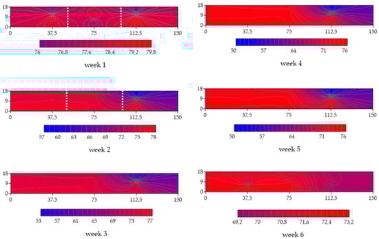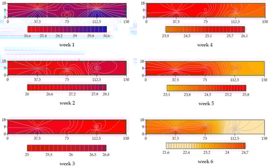 Kriging maps allow for the visualization of the spatial distribution of the evaluated variables. Figure 3 shows the distribution of temperature (t, °C) within the poultry house on a weekly basis, while Figure 4 illustrates the weekly variation in temperature.