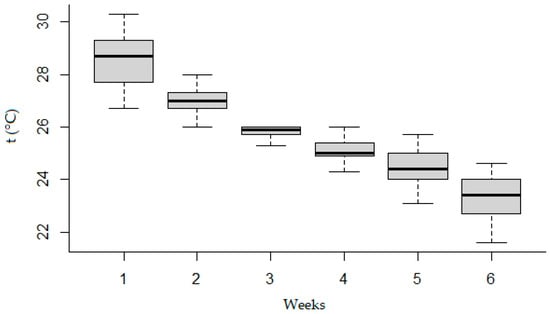 Weekly distribution of temperature (°C) inside the poultry house throughout the production cycle.