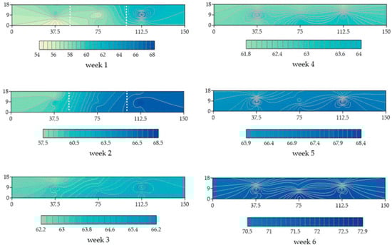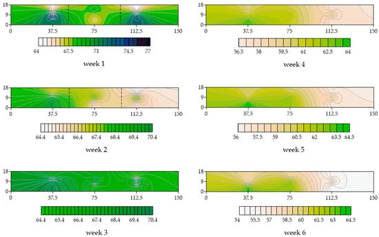 Kriging maps for the relative air humidity (RH, %) throughout the shed in the six weeks of rearing.