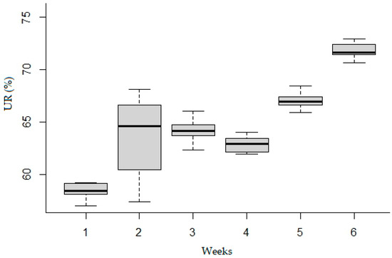 The coefficient of variation (CV) allows for the comparison of sample variability and the determination of experiment precision, serving as an indicator of the homogeneity of the collected data. According to Xue et al. [33], CV intervals of ≤10%, 10% < CV ≤ 100%, and CV > 100% indicate low, moderate, and high variability, respectively. Therefore, the experimentally collected data mostly present low variability, with weekly values below 10%. An exception occurred with ITU in the fourth and fifth weeks. However, these values are close to the lower limit of what is considered moderate variability.