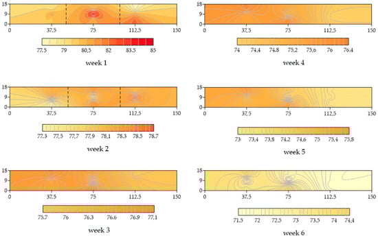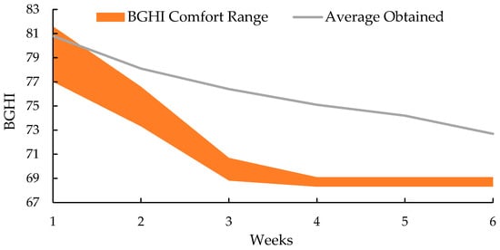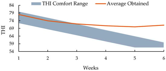Thus, Figure 7 indicates the comfort range of THI with the weekly average obtained, and Figure 8 complements the information with the spatial distribution for the six weeks of rearing.