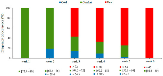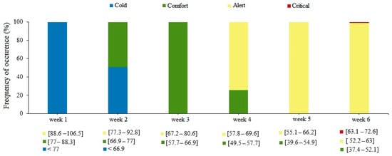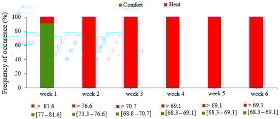 Figure 9 reveals good consistency in environmental variables during the first and sixth weeks, corresponding to zones of total thermal comfort and thermal discomfort, respectively. Although the second week showed signs of stress due to low temperatures (Figure 9), the poultry-housing area remained in comfortable conditions (Figure 7). In weeks 3, 4, and 5, only 25% of the area was classified as comfortable, with occurrences of both cold and heat discomfort. To ensure productive uniformity in the flock, it is essential to maintain consistency in the thermal conditions of the environment [62].