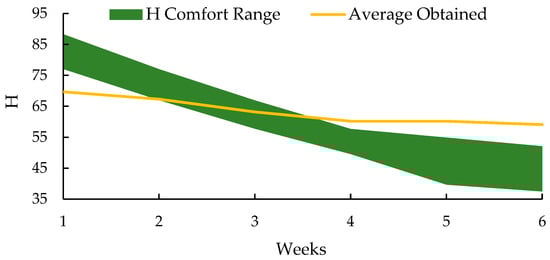 Weekly distribution of relative humidity (%) inside the poultry house throughout the production cycle.