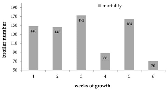 Increased mortality is associated with floor quality, neonatal septicemia, ventilation type, and producer management conditions [74]. Although some weeks experienced environments outside of the ideal thermal comfort conditions, the mortality rate observed during this production cycle is considered low.