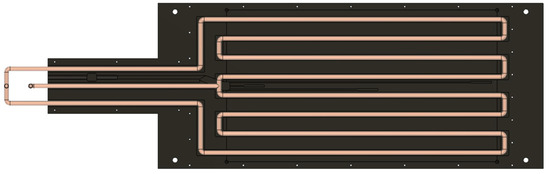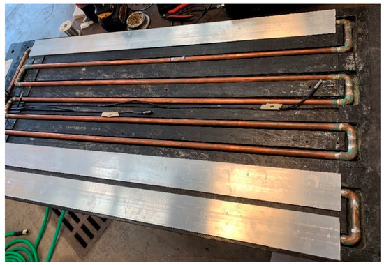 The cooling pad consisted of a high-density polyethylene (HDPE) base, a copper pipe network, an aluminum extrusion, and an aluminum diamond tread plate. The high-density polyethylene base was built from two pieces, each 61 cm wide and 2.5 cm thick. The main section was 120 cm long, and the head section was 60 cm long. The slots for the copper pipes and temperature sensors were milled using a computer numerical controlled (CNC) gantry sheet router. A specialized aluminum extrusion, ThinFin C® by Radiant Design & Supply (Bozeman, MT, USA), was used to enhance the internal heat transfer within the device. The mating area for the ThinFin C® was also recessed, so its top surface could be flush with the HDPE. The design of the pipe network is shown in Figure 1.