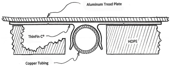 Except for the inlet and outlet connections, the pipes and ThinFin C® are covered with a piece of 3.2 mm thick aluminum diamond tread plate. This plate protected the sensors and pipes inside the cooling pad and also provided a textured surface to help prevent the sow from slipping if the cooling pad became wet. The space between the diamond plate and the inlet and outlet pipes was filled with an expanding foam window and door sealer to prevent debris from entering through these gaps and affecting the heat transfer capabilities of the cooling pad. A cross-section of the cooling pad, where the copper pipe and ThinFin C® can be seen, is shown in Figure 3. All cooling pads within the barn were connected to a single high-pressure coolant supply plenum with individual pressure reducing valves between the plenum and each pad. This ensured that the flowrate through an individual cooling pad would not be affected by the overall number of pads operating at any given time.