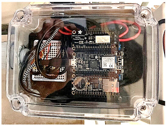 The control system for the hog cooling pad was microcontroller-based and mounted on vertical structural extensions from the cooling pad supporting inlet and outlet pipes. Due to the corrosive nature of the air in the farrowing house, all sensitive electronics were sealed inside an ingress protection (IP68) airtight enclosure. External connections were made through watertight pass-through connectors. A PVC pipe was installed between the inlet pipe and one of the outlet pipes on the cooling pad to protect the temperature sensor wires from piglets. A 12 V, IP67-rated power supply was attached above the control box to provide power for the coolant flow solenoid. The control system inside the enclosure is shown in Figure 4.