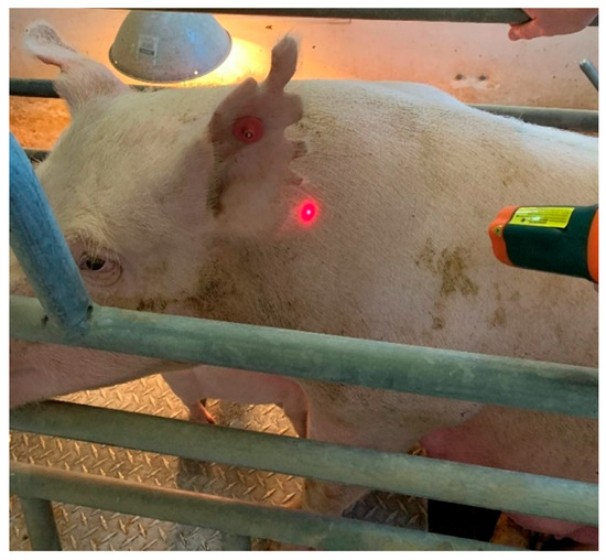 Measuring sow skin temperature behind the ear with an infrared thermometer.