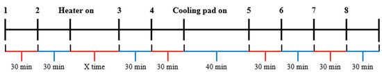 The experimental protocol for the testing of coolant control schemes is shown in Figure 6. This schedule was used for each of the individual experiments conducted. At each identified time during an experimental run, sow skin temperature, rectal temperature, and respiration rate were measured. Data points 1 and 2 were taken as baseline measurements for the sows, before any heating or cooling started, so the effects of heat stress and the cooling pad could be compared to each sow individually. The data from these two points were averaged if both were available. The room heater was then turned on and set to the desired barn ambient temperature of either 27 °C or 32 °C. Once the room reached the desired set point, two more data points were collected from each sow, approximately 30 min apart (data points 3 and 4). The cooling pads were then turned on and given 40 min to remove any transient cooling effects. Finally, four more data points were collected from each sow, again approximately 30 min apart (data points 5, 6, 7, and 8). After the eighth data point was collected for each sow, the room heating was turned off, and the sows were given time to cool-down before the protocol was repeated using different conditions. Two repetitions of each treatment combination were planned under this experimental plan.