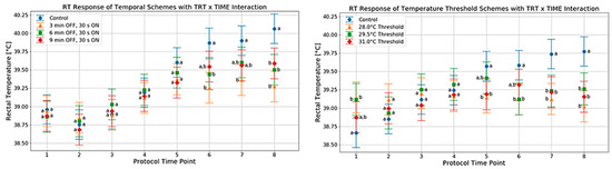 Rectal temperatures for temporal control schemes (left) and temperature threshold control schemes (right) from coolant control scheme experimentation, where ‘a’ indicates the first repetition and ‘b’ indicates the second.