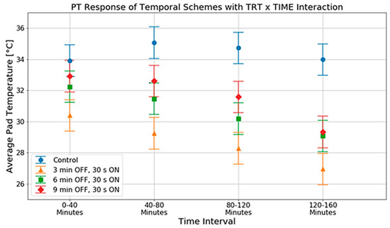 The potential effects for 40 min sampled data were treatment, time, the interaction of treatment and time, sow body weight, parity, sow backfat thickness, and sow loin depth, where time was an integer value from one to four, representing which section of the protocol the data were sampled from. Effects with p > 0.20 were removed, and the model was rerun to better elucidate the significance of the remaining effects. All analysis was performed in SAS® using the PROC MIXED procedure. The only significant interaction between treatment and time was for the average pad temperatures among the temporal schemes, as shown in Figure 9. The average pad temperatures among temperature threshold schemes with no interaction effect can be seen in Figure 10. Additionally, the average heat transfer rates with no interaction effect for temporal and temperature threshold schemes can be seen in Figure 11 and Figure 12, respectively.