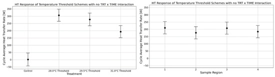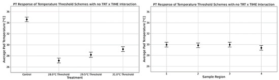 The rectal temperatures also demonstrated a significant interaction effect between treatment and time for the temporal (p = 0.0004) and temperature threshold (p < 0.0001) schemes. While none of the factors besides treatment, time, and their interaction were significant for the temporal schemes, sow body weight (p = 0.0379), parity (p = 0.0128), and sow loin depth (p = 0.0087) were all significant effects for the temperature threshold control schemes. The rectal temperatures at each protocol time point can be seen in Figure 8, with the temporal control schemes on the left and the temperature threshold control schemes on the right.