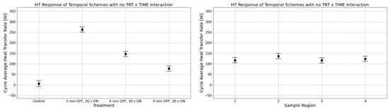 Average heat transfer rates for temporal schemes (left) and the sample region of the experimentation (right) on 40-min averaged data from coolant control scheme experimentation.