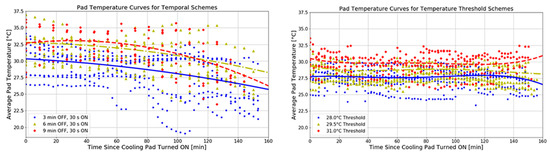 Average pad temperatures for temporal schemes (left) and temperatures for temperature threshold schemes (right) from coolant control scheme experimentation.
