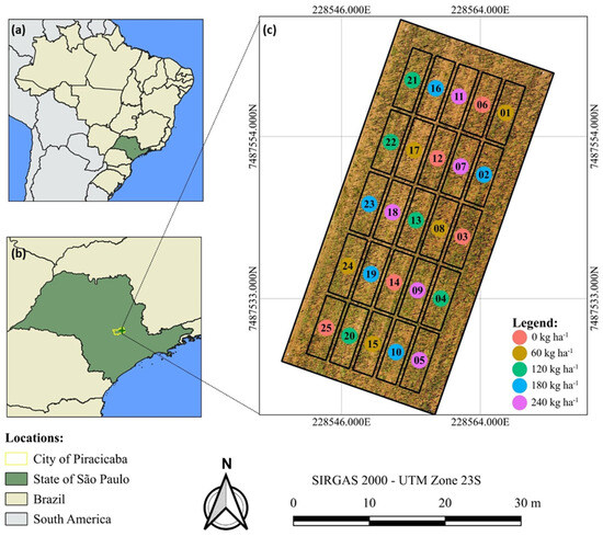 Site location in Brazil (a) and in the State of São Paulo (b). Experimental design and nitrogen doses (c).