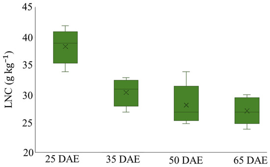 Boxplot graph of the LNC values at 25, 35, 50, and 65 DAE.