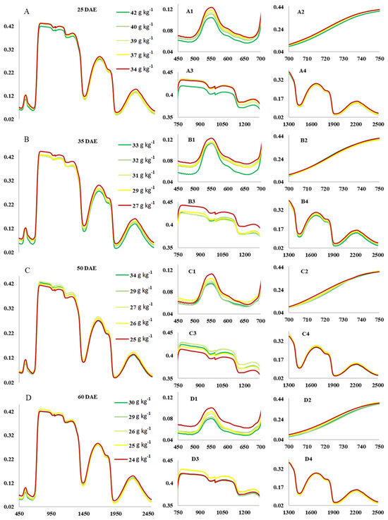 The complete spectrum at 25, 35, 50, and 65 DAE followed a general pattern, with a low reflectance in the Vis region (450–700 nm), a high reflectance in the NIR region (700–1300 nm), and two water absorption peaks (1450 and 1950 nm) in the SWIR region (1300–2500 nm) (Figure 3A–D).