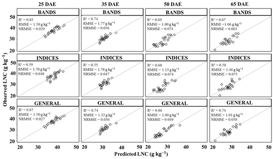The PLSR proved to be favorable in the prediction using hyperspectral data and vegetation indices, since it resulted in an R2 > 0.54 and an RMSE < 1.79 g kg−1 (Figure 4). Nevertheless, the performance patterns of the predictive models revealed variations, which were intrinsically associated with the specific vegetative stage of the crop and the datasets used in the modeling. For example, at the stage of 25 DAE (V4), the models (R2 = 0.85) exhibited a better adaptability when built only with the spectral bands (450 to 2500 nm). On the other hand, for the other collection dates (35, 50, and 65 DAE), the models exhibited similar R2 values (0.74, 0.69, and 0.67, respectively). This fact may be correlated with the LNC of the crop, since the highest levels (Figure 2 and Figure 3A) were found in the first collection (25 DAE), while the rates at 35, 50, and 65 DAE were similar. According to Davies et al. [53], the N consumption by corn plants during the initial vegetative stages was low, increasing rapidly as the plant developed, which explains the variation in the LNC.