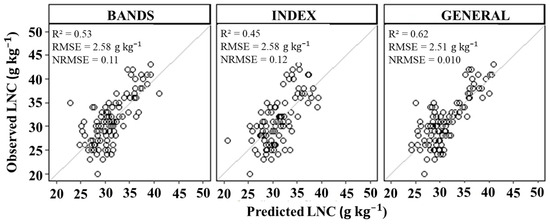 Relationship between observed and predicted LNC, including all collections: spectral signatures, indices, and general prediction (bands + indices), using partial least squares regression (PLSR).