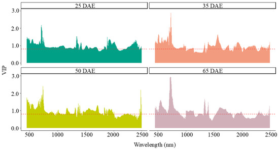 Wavelength variable importance in projection (VIP) scores (dashed red line) at 25, 35, 50, and 65 DAE. Variable relevance > 0.8.