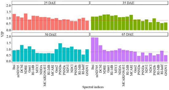 VI variable importance in projection (VIP) scores (dashed red line) at 25, 35, 50, and 65 DAE. Variable relevance > 0.8.