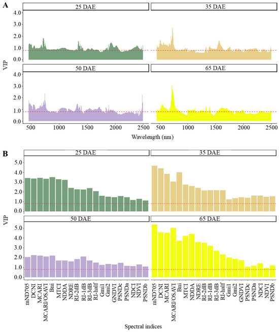The validation process was performed on the datasets used in the prediction by band and by VI (Figure 8). The model validation generated results similar to the prediction by band, with the peaks and valleys basically in the same regions at 25, 35, 50, and 65 DAE (Figure 8A). On the other hand, for the validation of the VIs, all the indices presented relevance (>0.8) in all collections; nevertheless, the divergence in the magnitude of importance in validation was greater in relation to the VIP score, especially for the first seven indices in the first collection (mND705, DCNI, MCARI, MCARI/OSAVI, Bni, MTCI, and NDDA) and the first five in the second (mND705, DCNI, MCARI, MCARI/OSAVI, and Bni). In the third collection (50 DAE), there was less variation among the VIs, and, in the fourth collection (65 DAE), the first 10 VIs (mND705, DCNI, MCARI, MCARI/OSAVI, Bni, MTCI, NDDA, NDRE, RI-2dB, and RI-1dB) showed prominence compared to the others (Figure 8B).