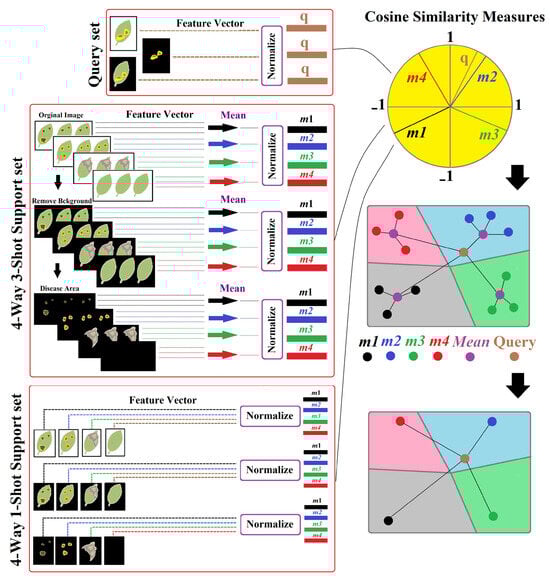 In the era of data-driven decision-making, it is becoming increasingly challenging to obtain the required amount of data to solve complex problems. This is especially true when it comes to classifying and labeling objects that are rare or hard to find. Traditionally, these tasks are addressed by using data augmentation or data labeling, but these methods can be time-consuming and expensive. When the number of examples per class is very small, data augmentation and labeling methods may not work efficiently. However, shot learning is an innovative method developed to solve these kinds of problems. Shot learning enables machine learning models to learn from a limited number of examples and generalize to new and unseen data, making it an effective solution when dealing with small datasets. The ability of shot learning to learn and generalize with limited data makes it a promising approach for plant disease diagnosis [21]. In a few-shot learning scenario, the model is given by a support set S and a query set Q. The query sample x ∈ Q is a new sample that has not been seen by the model before. The objective of the few-shot task is to accurately predict the class of the query sample based on the support set [22].
