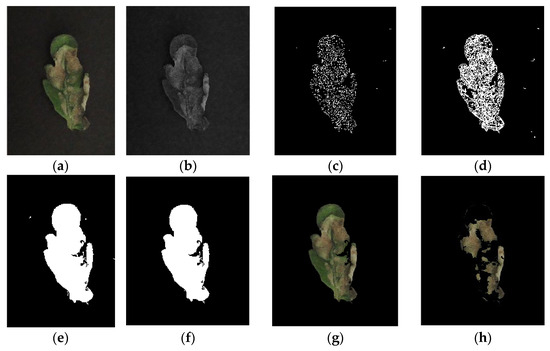 The preprocessing steps involved in analyzing plant images for disease detection. The processes include the following: (a) Original image, (b) extraction of the green color band from the image, (c) edge detection, (d) morphological dilation to connect the edges, (e) filling in the blanks in the edge image, (f) noise removal, (g) background removal, and (h) infected area extraction.