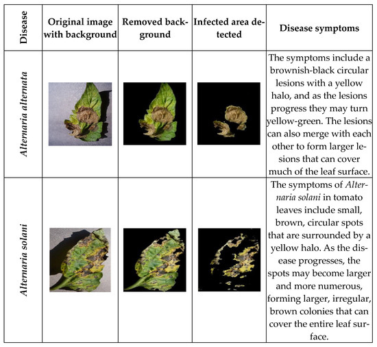 - Nazari, K.; Ebadi, M.J.; Berahmand, K. Diagnosis of alternaria disease and leafminer pest on tomato leaves using image processing techniques. J. Sci. Food Agric. 2022, 102, 6907–6920. [Google Scholar] [CrossRef]