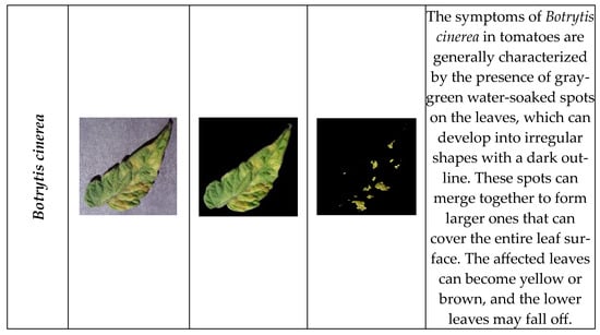 In studies that involve identifying diseased areas in plant leaves, selecting the appropriate value of K and the region of interest (ROI) can be time-consuming and prone to errors. To address this challenge, it is often advantageous to use automatic K-means clustering to accurately distinguish between disease symptoms and healthy areas of the leaf. This study employed K-means clustering to automatically identify disease symptoms in plant leaves. By determining the ROI automatically by thresholding based on color differences between diseased and healthy leaf areas, only the diseased area remained after thresholding. Figure 3 presents the diseases examined in this study—Alternaria alternata, Alternaria solani, and Botrytis cinerea—showing how image processing was used to remove the background and detect diseased areas.