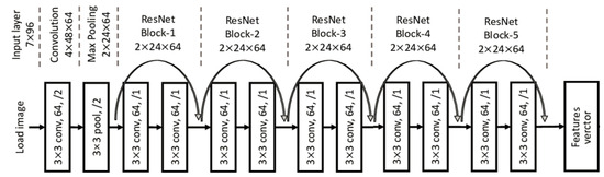 The ResNet-12 model is a type of CNN architecture that is commonly used for feature extraction in image classification and computer vision tasks. With ResNet-12, features can be extracted from images in a variety of ways [17]. The first step for extracting features from an image using ResNet-12 involves resizing the image to a fixed size, normalizing the pixel values, and converting the image to a suitable color space (Figure 4). For the ResNet-12, the input image typically has a resolution of 224 × 224 pixels and is normalized to the [0, 1] range. In ResNet-12, the input image is passed through a stack of convolutional layers, which detect and extract patterns at different scales and orientations. Each convolutional layer convolves the input image with a set of learned filters, followed by a nonlinear activation function. The output of each convolutional layer is a feature map, which represents the filtered response of the input image at a specific location and scale.