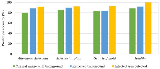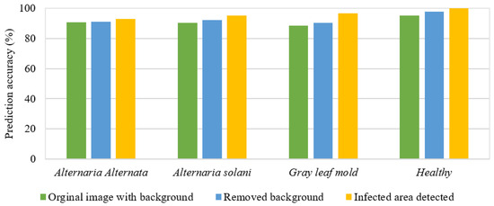 Figure 7 shows the cosine similarity values between the feature vectors extracted in ResNet-12 deep learning with the feature vector of the test image in the four-way three-shot learning approach. For this purpose, three images were used for each group of tomato leaves including three disease groups and one healthy leaf group. Feature extraction from images was performed by ResNet-12 deep learning and finally, cosine matching of the feature vectors extracted from the image was performed by one image for each group. The results for images with background for the three diseases Alternaria alternata, Alternaria solani, and Botrytis cinerea and healthy leaves were 90.96, 90.37, 88.33, and 95.02%, respectively. These results show a higher accuracy compared to the four-way one-shot learning method for this group of images. For the images with the removed background, the results for the similarity percentage were 91, 92.23, 90.13, and 97.63%, respectively. An improvement in the similarity percentages was observed for such images. Finally, the results showed a very good performance in the diagnosis of the three diseases and healthy leaves, respectively, with similarity percentages of 92.75, 95.07, 96.63, and 100% for tomato plant leaf images with removed backgrounds and separated infected areas. This few-shot disease diagnosis approach shows higher accuracy compared to the four-way one-shot learning method. Figure 8 shows a comparison of the accuracy of the few-shot learning methods for the three tomato fungal diseases used in this research.