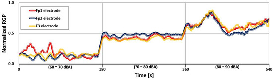 Figure 8 presents variations in RGP at the prefrontal lobe (Fp1 and Fp2) and frontal lobe (F3) for the three groups classified based on the degree of the human body response corresponding to equivalent noise levels (60–70 dBA, 70–80 dBA, and 80–90 dBA).