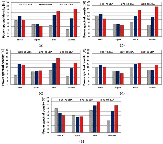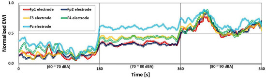 Figure 10 shows variations in EWI at the prefrontal lobe (Fp1 and Fp2), frontal lobe (F3 and F4), and parietal lobe (Pz) for the three groups classified based on the degree of the human body response corresponding to equivalent noise levels (60–70 Dba, 70–80 Dba, and 80–90 Dba).