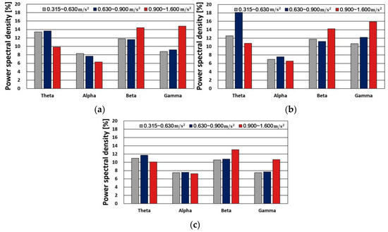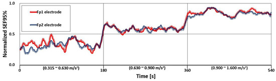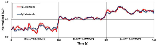 Figure 12 presents variations in RGP at the prefrontal lobe (Fp1 and Fp2) for the three groups classified based on the RMS of vibration (0.315–0.630 m/s2, 0.630–0.900 m/s2, and 0.900–1.600 m/s2).