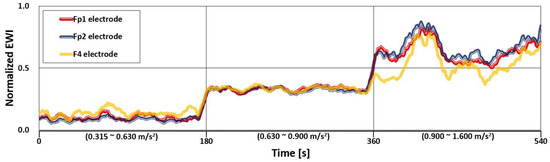 As the sum of RBP and RGP was smaller than the sum of RTP and RAP or indicated no significant difference (* p < 0.05) depending on the state for the prefrontal lobe (Fp1 and Fp2) and right frontal lobe (F4), it is deemed inappropriate to evaluate the agricultural work stress caused by vibration with the EWI indicator. Figure 14 presents variations in EWI at the prefrontal lobe (Fp1 and Fp2) and frontal lobe (F4) for the three groups classified based on the RMS of vibration (0.315–0.630 m/s2, 0.630–0.900 m/s2, and 0.900–1.600 m/s2).