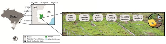 Chisel pasture (CHI): This included soil chisel management with manual rows in contours. Lime (1 t ha−1) and NPK fertilizers (30 kg ha−1 of K2O and 110 kg ha−1 of P2O5) were used. Brachiria brizhanta seeds were then replanted. After grass emergence, 100 kg ha−1 of N2O was applied.