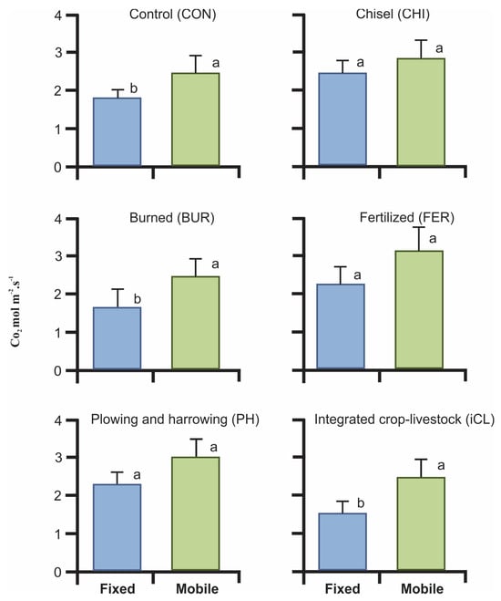 Mean ± standard deviation of CO2 (μmol m−2·s−1) flux emissions after fixing the PVC collars 30 d (FC) and 30 min (MC) prior to data collection, with six months of evaluation under different pasture management practices. Within each pasture management practice, the means with the same letter are statistically equal based on the Scott–Knott group of means (p ≤ 0.10).