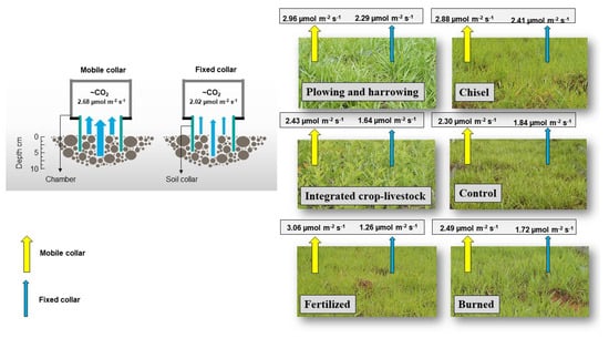 Carbon dioxide flux emissions (CFE) from agricultural areas exhibit spatial and temporal variability, and the best time of collar fixation to the soil prior to the collection of CO2 flux, or even its existence as a factor, is unclear. The objective of this study was to evaluate the effect of the fixation time of collars that support the soil-gas flux chamber based on the influence of CFE on different pasture management practices: control (traditional pasture management practice) (CON), chisel (CHI), fertilized (FER), burned (BUR), integrated crop-livestock (iCL), and plowing and harrowing (PH). A field study was conducted on the clayey soil of Udults. The evaluations were performed monthly by fixing the PVC collars 30 d and 30 min prior to each CFE measurement. Although a linear trend in CFE was observed within each pasture management practice between the two collar-fixation times, collar fixation performed 30 min prior led to an overestimation of CFE by approximately 32.7% compared with 30 d of collar fixation. Thus, CFE were higher (p ≤ 0.10) in the MC, when compared to the FC, when the CON, BUR, and iCL managements were evaluated. Overall, fixing the collar 30 d prior to field data collection can improve the quality of the data, making the results more representative of actual field conditions.