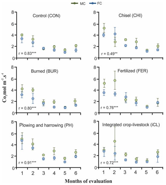 The correlation coefficient (r) between CO2 flux measured in the FC and MC (p ≤ 0.01 and 0.05) was calculated without considering the collection time. Means and standard deviations were calculated for each measurement during each month of data collection.
