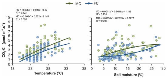 With an increase in soil moisture from 5 to 15%, CO2 flux emissions raised 0.84 μm m−2·s−1 in the FC and 1.56 μm m−2·s−1 with the use of the MC. When the soil moisture increased from 15% to 30%, the use of the FC had a greater influence, increasing the CO2 flux emissions to 1.67 μm m−2·s−1, whereas with the MC, the elevation was 0.91 μm m−2·s−1 (Figure 5). No significant regression coefficients were observed between the biomass-C and CO2 fluxes.